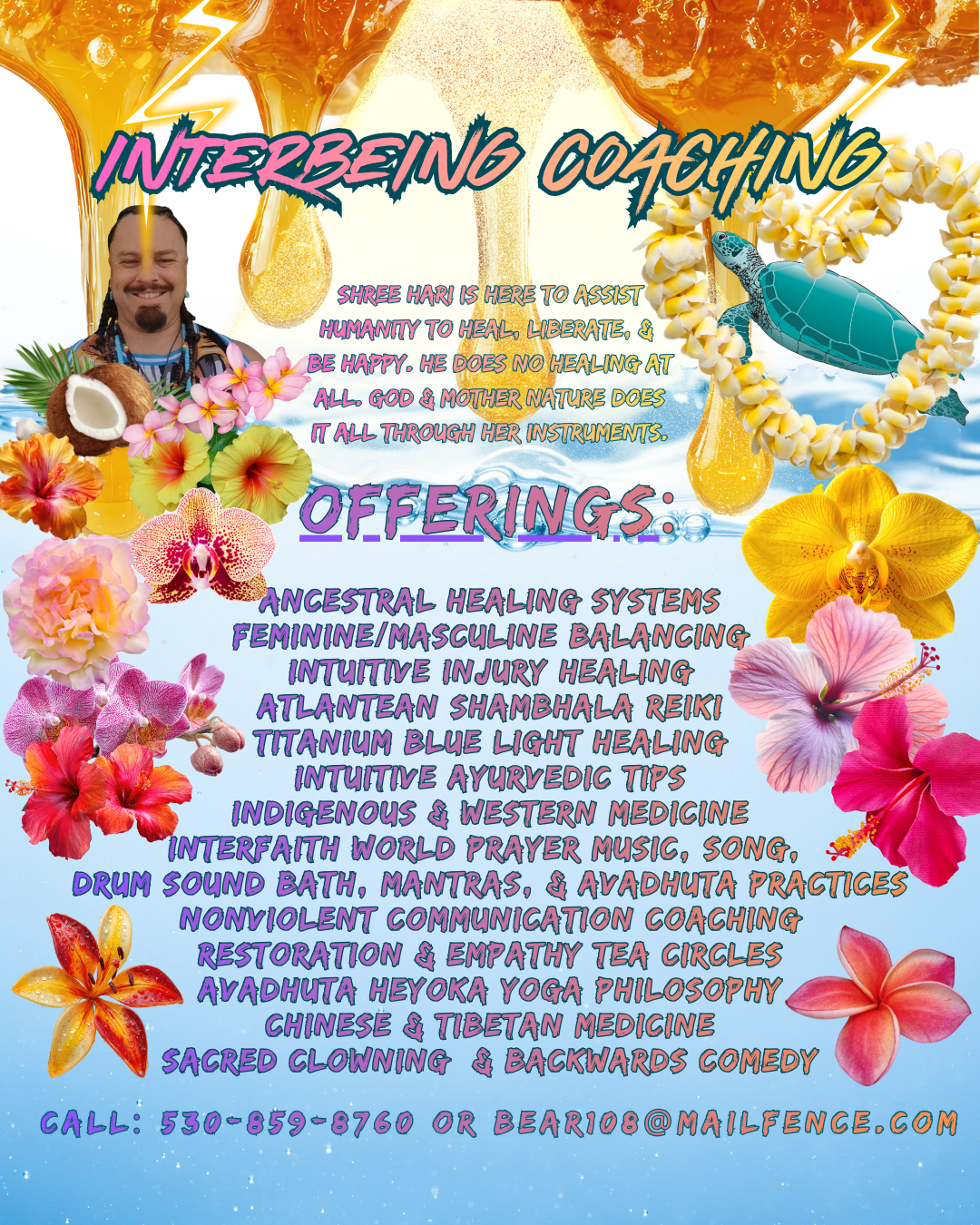 The content of the Interbeing Coaching web site (“Site”), including text, graphics, and images (“Content”), is educational only and not intended to be a substitute for medical advice, therapy, psychiatry, addiction recovery programs including the 12 step programs, diagnosis or treatment. Clayton “Shree Hari” Barker is not a medical doctor, therapist, psychiatrist, and does not claim to cure any disease, disorder, physical/mental illness, ailment, addiction, or sickness. Utilizing Interbeing Coaching, Avadhuta Heyoka sacred clowning, and energy healing in any form is at the client’s own risk. The client is taking complete responsibility of his/her own medical needs and/or care. If you have a medical or mental health emergency, call your doctor or 988 Suicide Crisis Hotline or 911 immediately. The information contained in this website is not intended to recommend the self-management of physical/mental health problems or wellness. It is not intended to endorse or recommend any particular type of medical, psychiatric, therapeutic, or addiction recovery treatment. Should any reader/client have any physical/mental health care related questions, promptly call or consult your physician, therapist, psychiatrist, addiction recovery counselor, 12 step sponsor, or healthcare provider. No information contained in this website should be used by any reader/client to disregard medical and/or any kind of mental health related advice or provide a basis to delay consultation with a physician, therapist, psychiatrist, addiction recovery counselor, 12 step sponsor, or a qualified healthcare provider. Interbeing Coaching and Clayton “Shree Hari” Barker disclaim any liability based on information provided in this website.